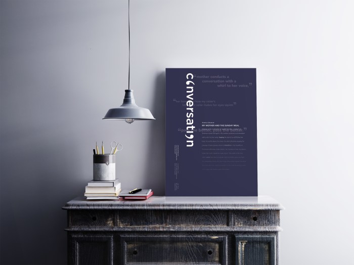 The purpose of the Logotype & Poster is to create visual organization and composition. As well as, explore information hierarchy within the poster, but also express symbolic importance through the logotype. The poster is created through the poem, My Mother and the Sunday Meal by America Salvatore. The poem gives the feeling of disconnection between the mother and her family, so the poem is displayed as if it is fading into the background. Hierarchy is shown with quotes from the mother. While the logotype, the word conversation, is read vertically to show that the conversation is going down hill. The symbolic importance in the logotype is the O’s are changed to one quotation mark to represent that the mother is talking to only herself.