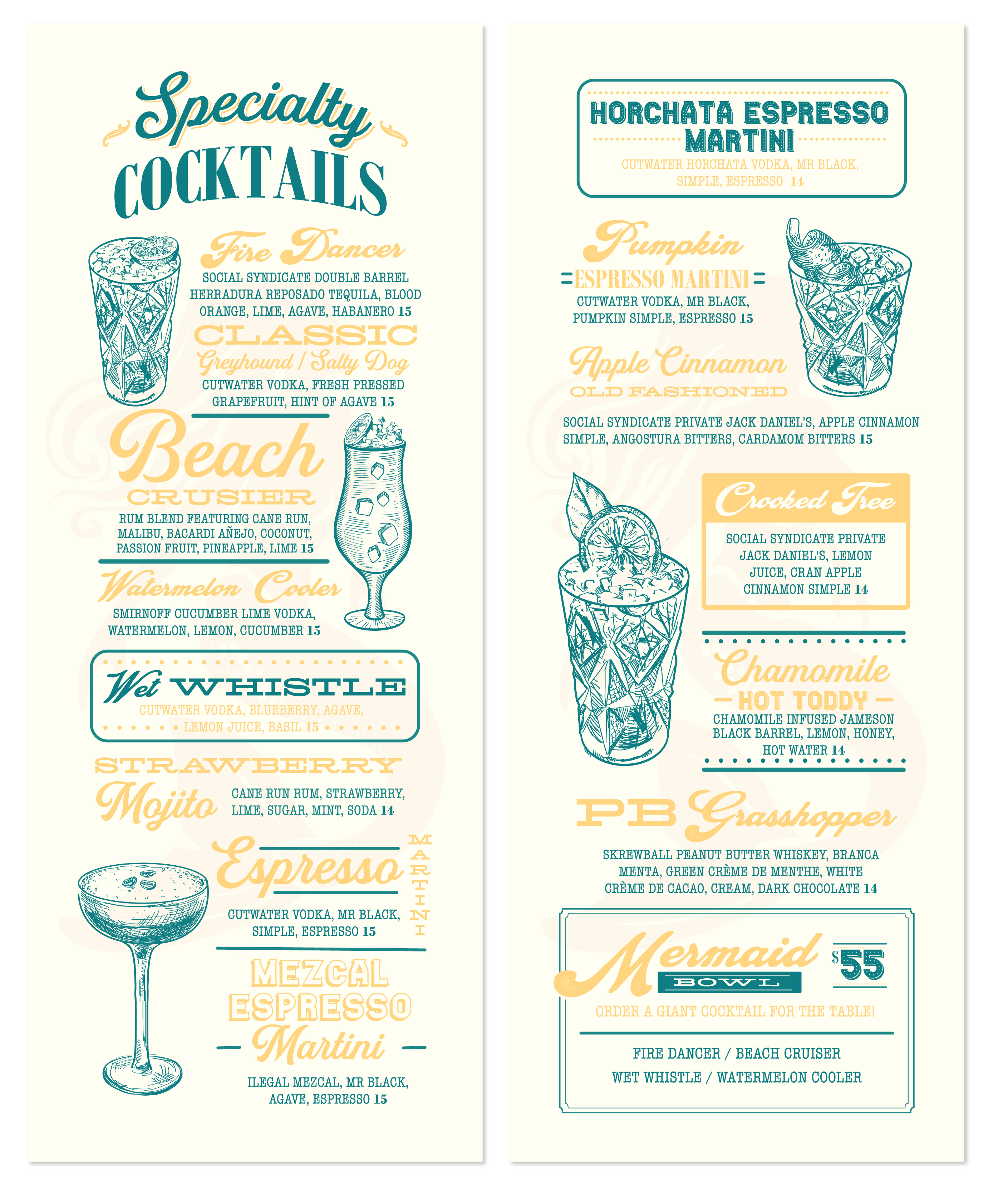 At Social Syndicate I was responsible with editing current menus but also creating new ones. The ones you see are all final designs that are currently/previously been used at those restaurants. I also have created one off menu designs for special events.