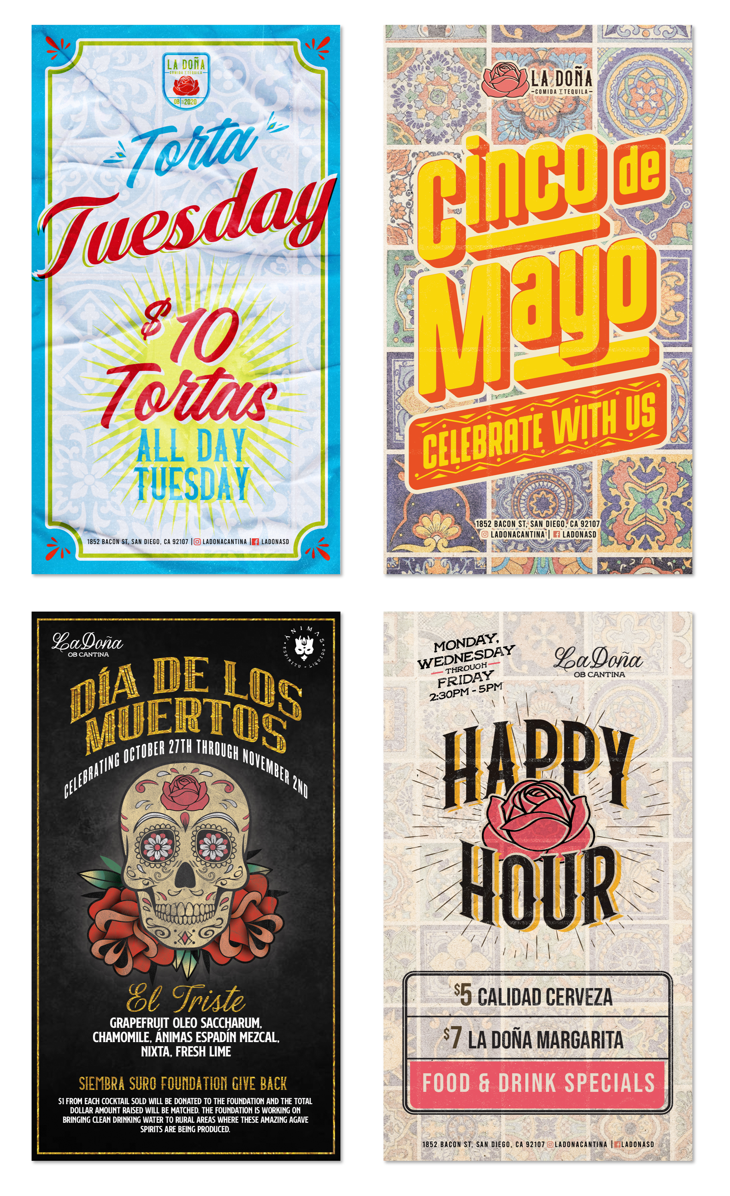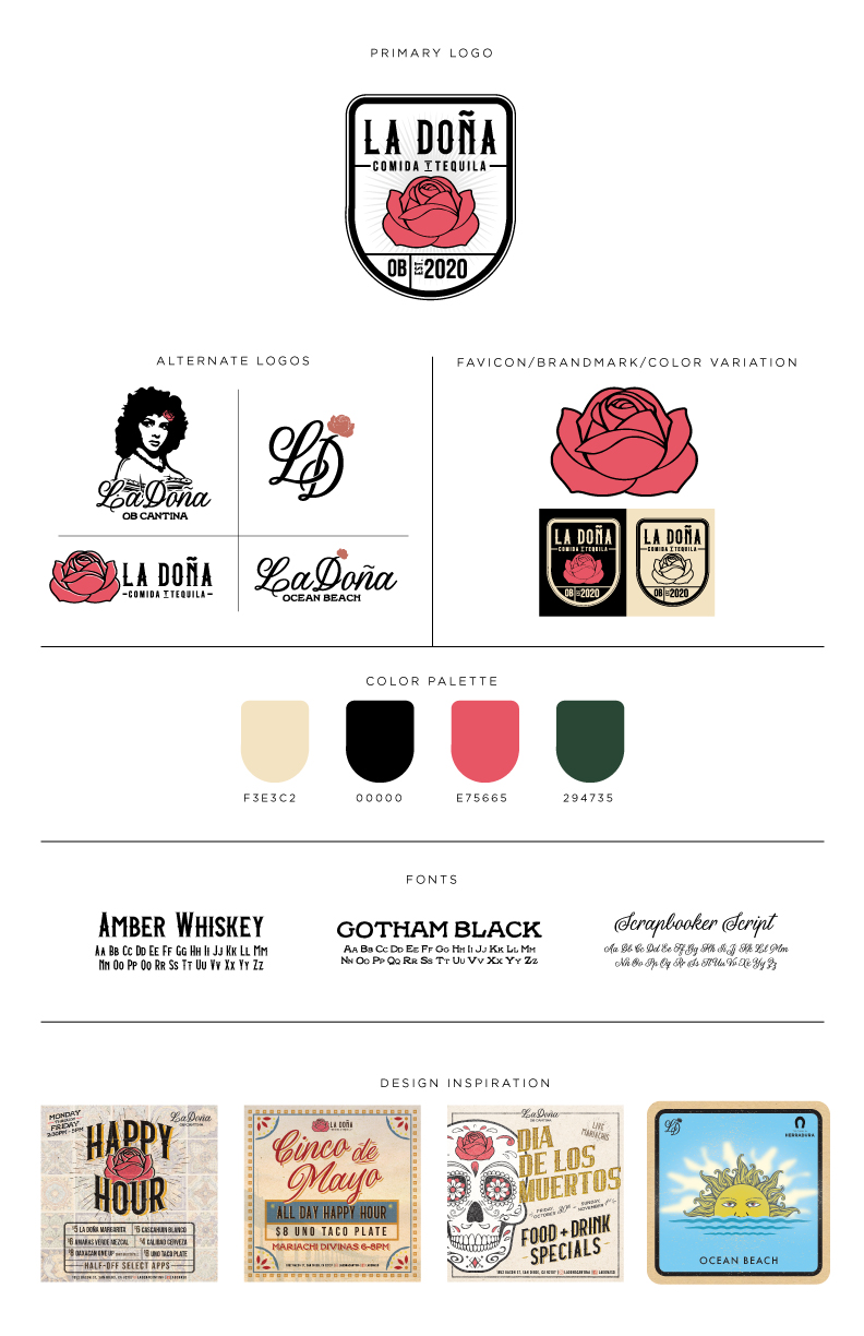 La Doña, a Mexican restaurant in Ocean Beach, is designed to celebrate the warmth and authenticity of home-style Mexican cuisine while embracing the relaxed, laid-back atmosphere of OB. The concept features a simple, clean, and modern aesthetic that blends traditional Mexican elements with a contemporary coastal vibe. The logo reflects this fusion, using bold yet minimal design elements that makes it stand out. The menu design mirrors this simplicity, with a focus on readability and bold colors. Merchandise and signage are thoughtfully designed to enhance the brand’s identity, incorporating Mexican style colors and patterns that tie into the coastal setting. Overall, every design element is crafted to create a welcoming, fresh, and authentic experience for guests, perfectly balancing the homey feel of Mexican comfort food with a modern, beachy twist.